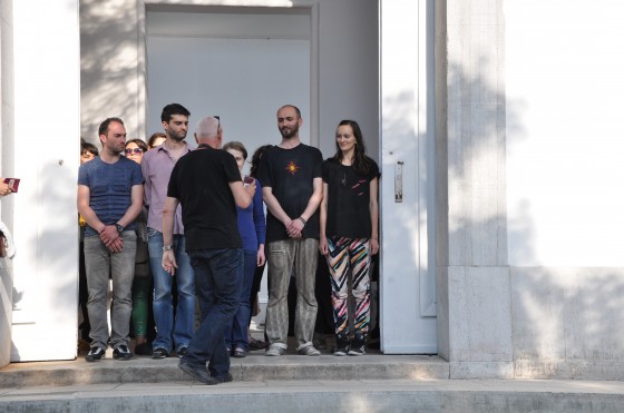 Alexandra Pirici and Manuel Pelmuş: An Immaterial Retrospective of the Venice Biennale, 2013. Quotation of “Wall Enclosing a Space”, intervention by Santiago Sierra, Spanish Pavilion, 50th International Art Exhibition: Dreams and Conflicts. The Dictatorship of the Viewer, 2003.